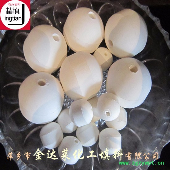 KK开孔瓷球全称惰性氧化铝开孔瓷球,它是在原有惰性瓷球的基础上,成型采用带开孔装置的钢模机压或手工成型,成型后的球体具有一个或两个、三个、五个、七个通直圆孔。KK开孔瓷球产品与一般普通的惰性瓷球相比,堆积空隙率提高6-10%,比表面积提高了15-25%。开孔瓷球比表面积越大,使接触反应的效率大。产品因具适宜的比表面积和较高的空隙率,可以减少床层重量,使净化器、反应器中的流体均匀分布,传质传热反应均匀、高效的进行,不使反应物和热量集中,大量地出现于局部地方. 开孔瓷球较高的孔隙率,能容纳吸附去除各种原料气液中的胶质、焦粉、重金属等固体颗粒杂质,防止运行过程因积炭导致催化剂中毒. 达到保护催化剂目的. 同时开孔瓷球反应塔器内使用时具有低的压降,减少了塔的阻力,提高了整个反应塔器的传质效率,对提高产量、改进产品质量具有重要作用。