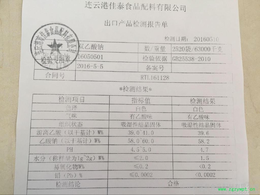 双乙酸钠为乙酸钠和乙酸的分子复合物,白色吸湿性结晶状固体,具乙酸臭。加热至150℃以上分解,可燃。lg乙酸钠可溶于约lmL水中,10%水溶液的pH为4.5~5.0。