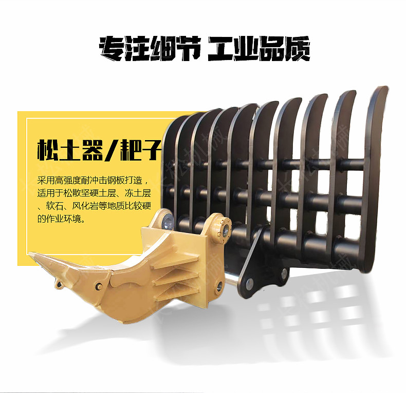 具有破碎、 翻松功能的可换工作装置,用于开挖有裂纹的岩石,破碎冻土,也用来挖开沥青路面、硬土、次坚石、风化石的粉碎、分裂,以便于用挖斗进行挖掘及装载作业。