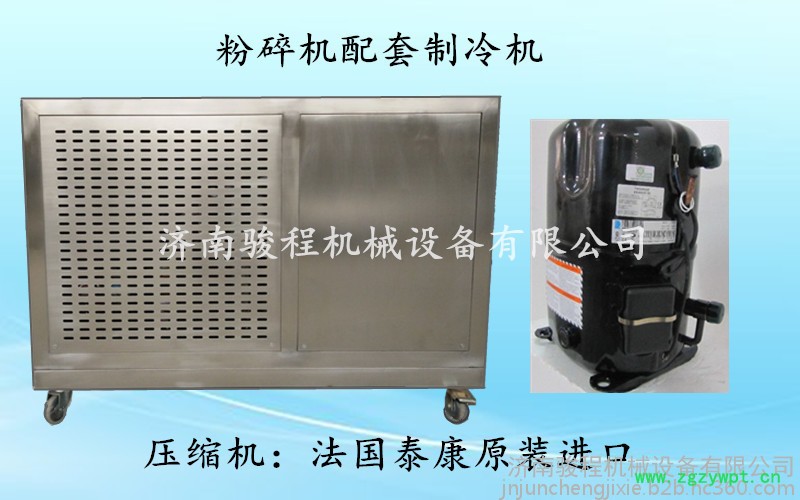 对于纤维状、高韧性、高强度、含油率高、含糖量高的物料采用普通粉碎方法很难达到超微粉碎。 济南骏程低温超微粉碎机在粉碎时可根据要求,通过向磨筒套内通入冷却水或配置制冷机来控制粉碎温度。采用冷冻超微粉碎方法,利用物料在不同温度下具有不同性质的特性,将物料冷冻至脆化点或玻璃体温度之下,使其成为脆性状态,在粉碎原料达到低温、粉碎机内部为低温情况下粉碎,物料与粉碎机内部均呈低温状态。粉碎天然植物在低温下其韧性出现均匀地降低,虽没有明显的脆性转变点,但随着温度降低其脆性增加的规律是存在的,并可找出一个脆性大的低温范围。并且,物料在快速降温情况下,各部位由于不均匀收缩而产生内应力,极易引起薄弱部位破裂和龟裂,导致物料内部组织结合力降低。物料在磨筒内不断被冲撞、挤压、剪切当受到一定的冲击时,极易破碎成细粉,达到超微粉碎的目的。