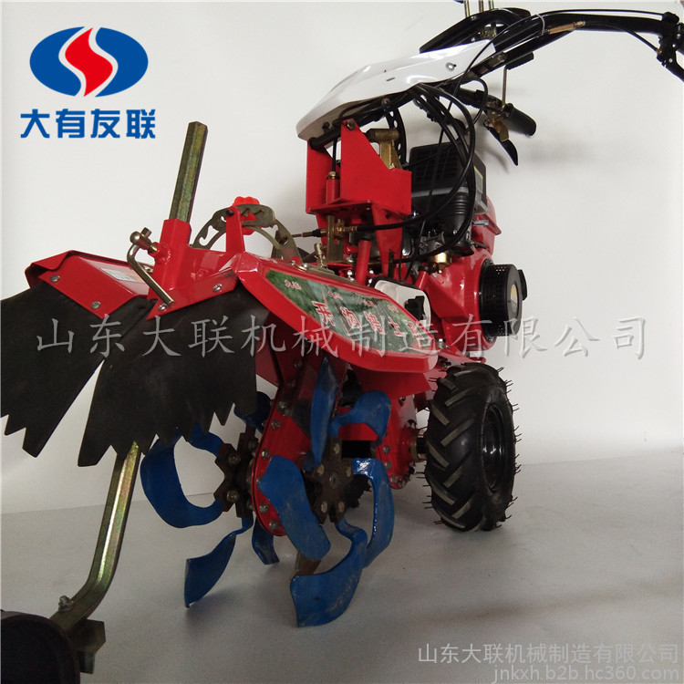 本机器包括机架、可调高低扶手,机架上设有(风冷或水冷)柴油机或汽油机、机架和扶手上设置有变速箱,变速箱的输出轴上设置有能够沿轴移动的驱动轮或链轨.传动方式主要有:全齿轮传动、皮带传动、链条传动三种传动方式.该机具有重量轻,油耗低、相对功率大,结构紧凑、机动性强、操纵轻便灵活的特点。可爬坡、越埂、阶梯性强。广泛适用于平原、山区、丘陵的旱地、水田、果园、菜地、烟地的深旋耕、浅旋耕、犁耕。配上相应机具可进行旱地旋耕、水田旋耕、抽水、开沟、喷淋、喷药除草碎土等作业,还可牵引拖车进行短途运输,是大中型农机无法**的多功能田园管理机,工作稳定可靠、使用寿命长、维修方便等特点。是进入农民家庭很理想的田园管理机。