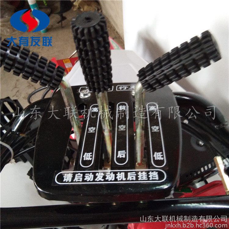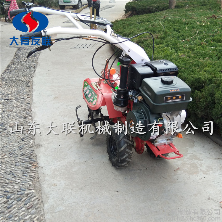 本机器包括机架、可调高低扶手,机架上设有(风冷或水冷)柴油机或汽油机、机架和扶手上设置有变速箱,变速箱的输出轴上设置有能够沿轴移动的驱动轮或链轨.传动方式主要有:全齿轮传动、皮带传动、链条传动三种传动方式.该机具有重量轻,油耗低、相对功率大,结构紧凑、机动性强、操纵轻便灵活的特点。可爬坡、越埂、阶梯性强。广泛适用于平原、山区、丘陵的旱地、水田、果园、菜地、烟地的深旋耕、浅旋耕、犁耕。配上相应机具可进行旱地旋耕、水田旋耕、抽水、开沟、喷淋、喷药除草碎土等作业,还可牵引拖车进行短途运输,是大中型农机无法**的多功能田园管理机,工作稳定可靠、使用寿命长、维修方便等特点。是进入农民家庭很理想的田园管理机。