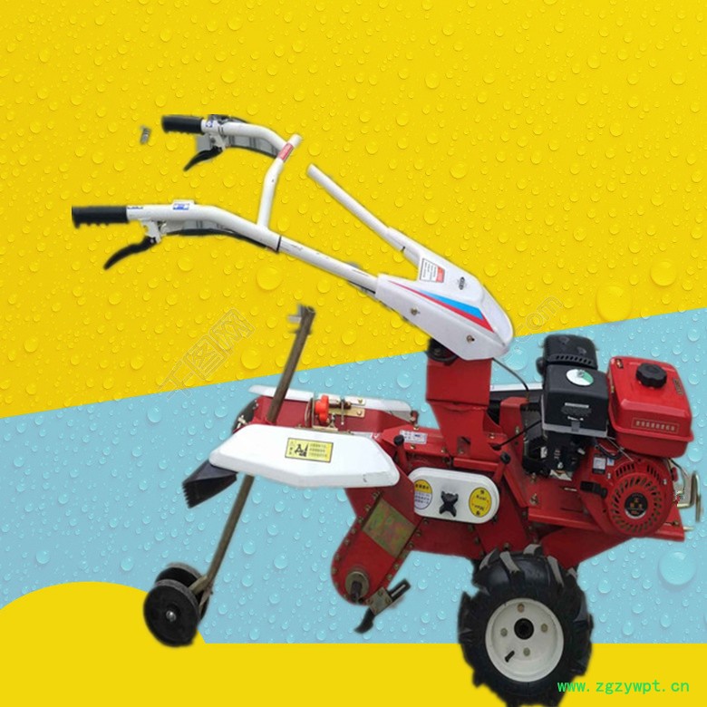 本机器包括机架、可调高低扶手,机架上设有(风冷或水冷)柴油机或汽油机、机架和扶手上设置有变速箱,变速箱的输出轴上设置有能够沿轴移动的驱动轮或链轨.传动方式主要有:全齿轮传动、皮带传动、链条传动三种传动方式.该机具有重量轻,油耗低、相对功率大,结构紧凑、机动性强、操纵轻便灵活的特点。可爬坡、越埂、阶梯性强。广泛适用于平原、山区、丘陵的旱地、水田、果园、菜地、烟地的深旋耕、浅旋耕、犁耕。配上相应机具可进行旱地旋耕、水田旋耕、抽水、开沟、喷淋、喷药除草碎土等作业,还可牵引拖车进行短途运输,是大中型农机无法**的多功能田园管理机,工作稳定可靠、使用寿命长、维修方便等特点。是进入农民家庭理想的田园管理机。