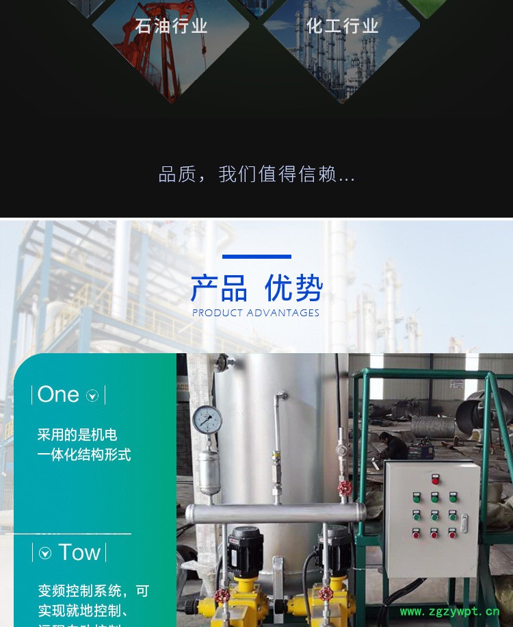 加药装置的单元组合形式主要视机组容量大小,锅炉配置的方式(二炉共用一套或单炉单套等),自动化水平的高低(自动或手动控制),加药泵种类的选用(交流或支流马达,进口或国产泵)灵活的组成各种不同形式单元,安装在一个底座上,这种工厂化的整套装置,大大减少了设计和现场安装的工作量,对整机的质量,安全和现场投运提供了可靠的保证.