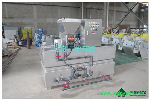 本装置是粉状药剂的全自动连续配置及投加系统。干粉药剂从料斗下部的螺旋推进器进入预混器与清水进行预混,被湿润的物料进入配制槽进行稀释混合,按用户要求浓度进行配制;配制溶液从配制槽经熟化槽再进入储存槽,当储存槽液位处于高位时,配制过程自动停止,当溶液下降到低液位时,自动启动配料过程。配制槽和熟化槽均设置搅拌器,充分保证药剂的稀释和熟化。配制流量及浓度可通过调节进水流量和调节螺旋轴转速来确定。