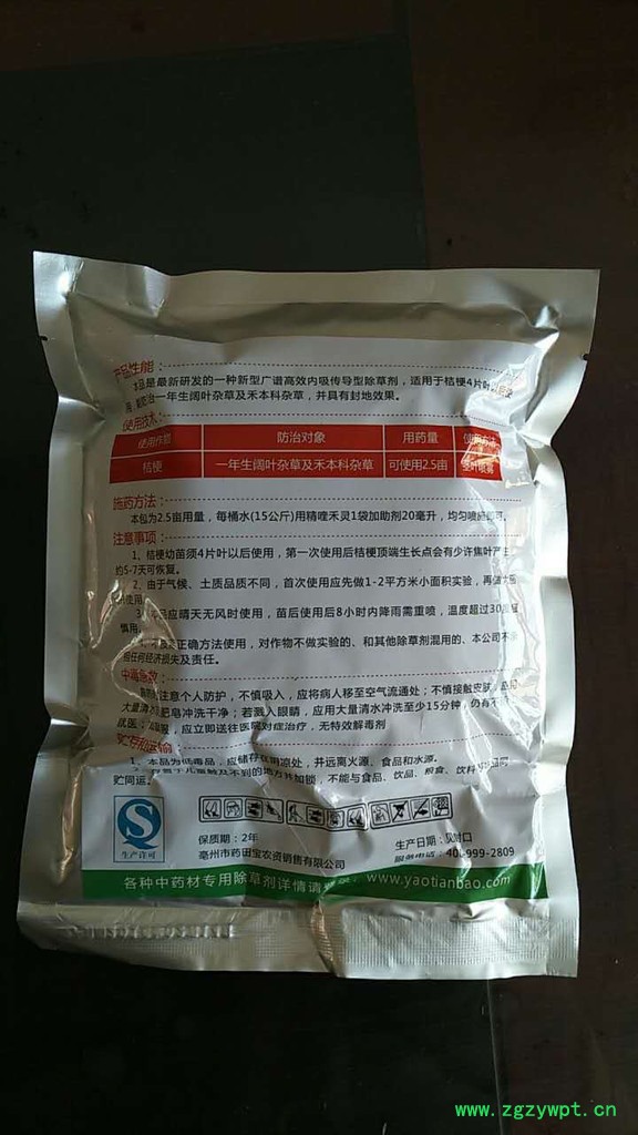 使用方法:亩用药田宝1袋加本助剂2包(64mg)混合使用,稀释后兑水30公斤,均匀喷雾与地表。