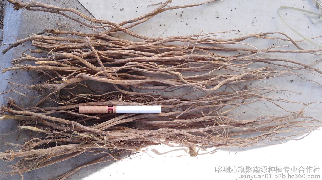 【药材】干燥根呈细圆柱形或直条状,两头较细,很少有分歧,长15~30厘米,直径3~8毫米。外表淡黄色,粗糙,具纵纹及未除尽的棕黄色栓皮,并有棕色点状的支报痕迹,顶端往往残留圆柱状的根茎。质硬而脆,易折断。断面不整齐,淡黄色,中央有黄色放射状的木质部,形成层呈圆环状,深褐色。气微,味甘。
