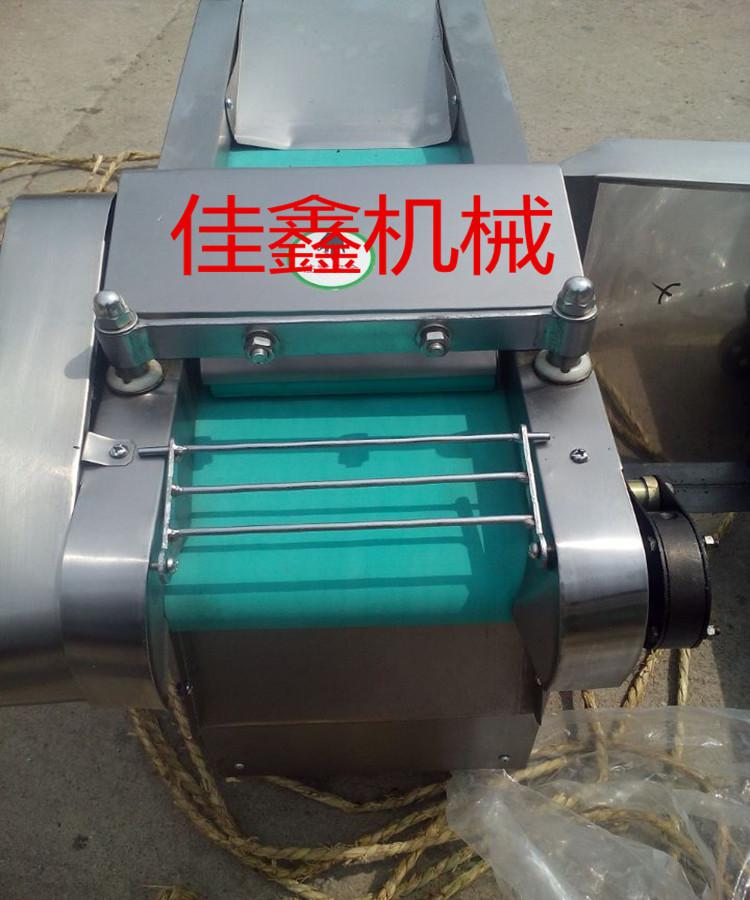 先转动可调偏心轮,使刀架行至下死点后,再使刀架向上抬起1/2毫米,使竖刀与输送带接触后,紧固螺母把竖刀紧固在刀架上。说明:刀架抬起高度可根据所切蔬菜自行掌握。如果高架抬起高度小,蔬菜有可能连刀,如果高架抬起高度过大,有可能切坏输送带。