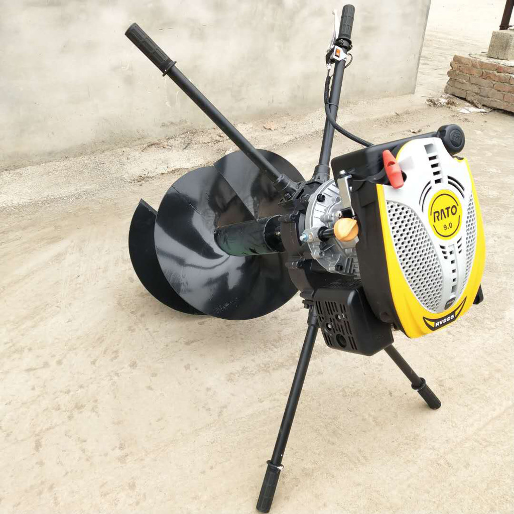 手持式植树挖坑机由机架,传动轴,变速箱,钻头组成,由拖拉机上的动力输出接口链接万向节从而带动传动轴旋转,通过高变速比的变速箱转减速带动钻头旋转,由螺旋钻头将沙土向上输送堆积,完成挖坑作业过程。