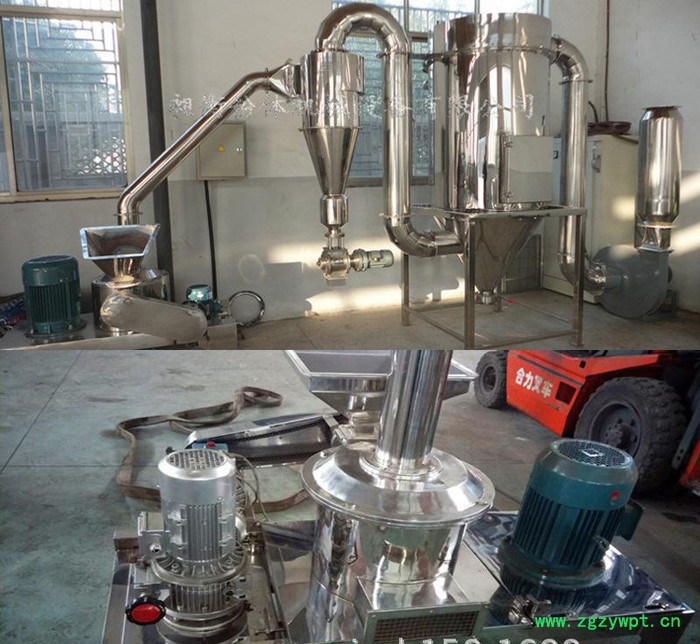该机有粉碎主机、旋风分离器、脉冲除尘箱等部分组成。物料由加料斗进入粉碎室,通过高速旋转的锤片进行粉碎,粉碎细度可调节分级刀与分级盘的距离来达到所需要的细度,粉碎好的物料经转子离心力和引风机的作用进入旋风分享器,然后通过关风机出料,粉尘进入脉冲除尘箱,经过过滤筒过滤后回收利用。该机按“GMP"标准设计,超微粉碎机整机全部用304不锈钢材料制造,粉碎过程无粉尘飞扬。