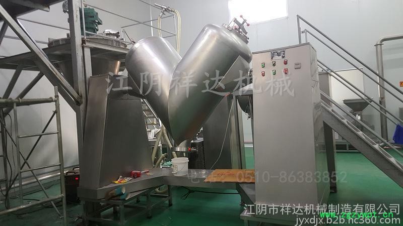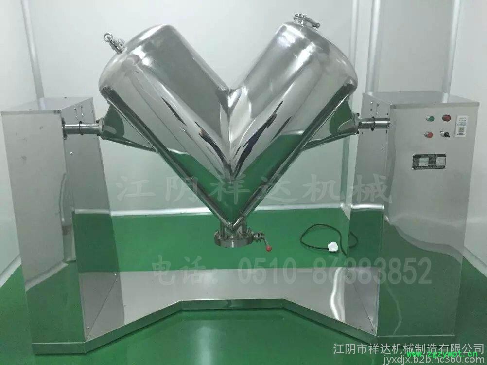 V型混合机是一种新型、高效、高精度的混合设备,它适用于化工、食品、医药、饲料、陶瓷、冶金等行业的粉料或颗料状物料的混和。该机结构合理、简单、操作密闭,进出料方便,(人工或真空加料)筒体采用不锈钢材料制作便于清洗,是企业的基础设备之一。该机自转均有一套电机及摆线针轮减速机来完成,混合速度快,对比重悬殊,混配比较大的物料混合更为适合。本机物料接触部分均为不锈钢制造。