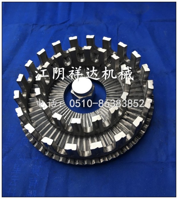 相互交错排列,活动齿圈相对运转,使物料在固定齿和活动齿之间相
