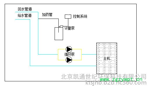 根据人工设定微电脑时间控制开关,控制计量泵的启停,来向系统投加药剂。
