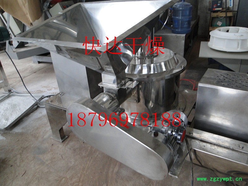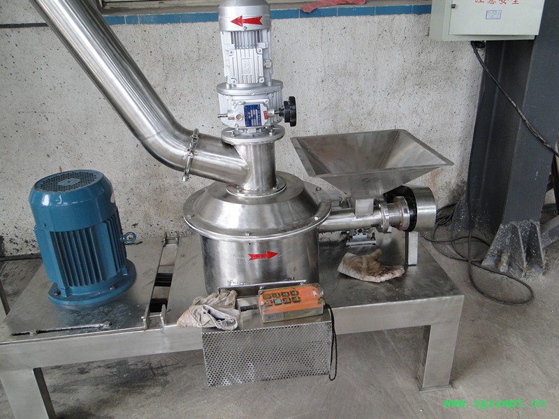 物料由料斗经螺旋输送器进入粉碎室,被高速旋转的刀片剪切粉碎,通过负压风运的方法把物料运入旋风分离器,袋式除尘器、排出物料达到产品的要求。