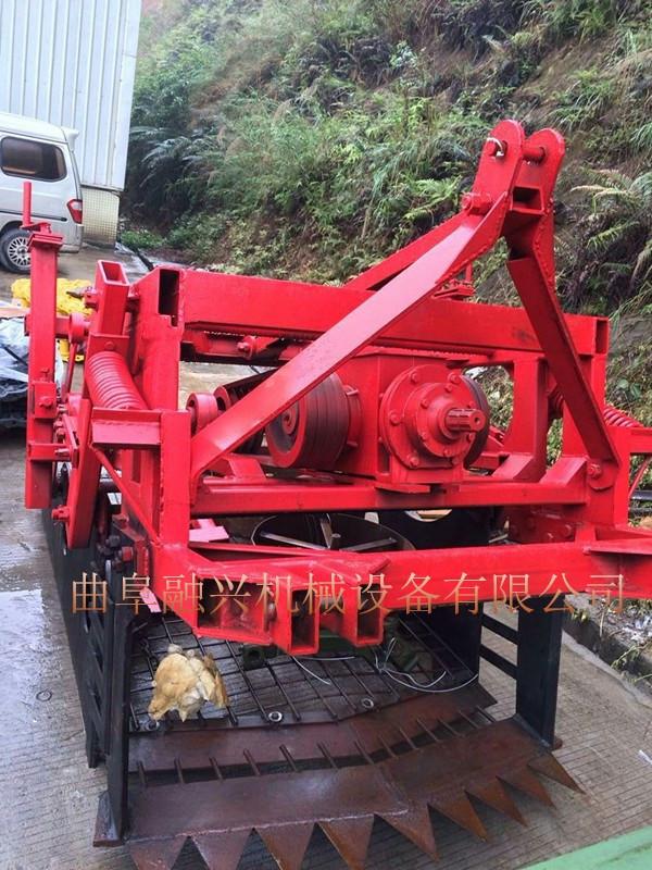 曲阜融兴药材收获机在于克服现有技术中的缺陷,提供一种结构简单、方便实用,省时省力和工作效率高的根茎类药材收获机,工作原理:经悬挂架将本机固定在大型**拖拉机后悬挂上,变速箱经动力输入轴与拖拉机上的输出轴相连接,开动机器,松土铲插入土壤中(如果深度不够,可以把拖拉机后边所带的上拉杆调短),将药材的根茎从土壤中铲出,根茎连同土块进入振动筛上,对包裹药材根茎的土块进行振动操作,振动掉一部分土块,振动后的土块和药材根茎进入前传输带上,再漏掉一部分土块,在前传输带运输的过程中,机子自带的碎土压辊可将大土块碾压成小土块,经过碾压处理后的土块和药材根茎进入后传输带上,压碎的土块经后传输带漏掉,后传输带将药材根茎送入回收箱内,完成药材的收割回收,网状式输送带可对药材根茎进行98%以上的回收,大大提高了工作效率。