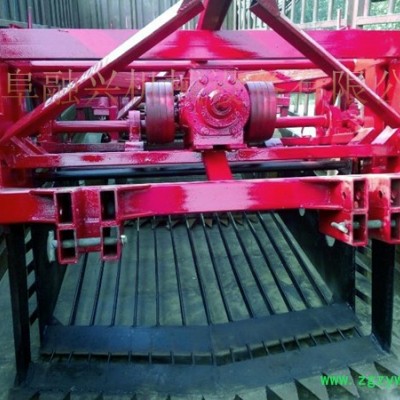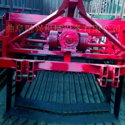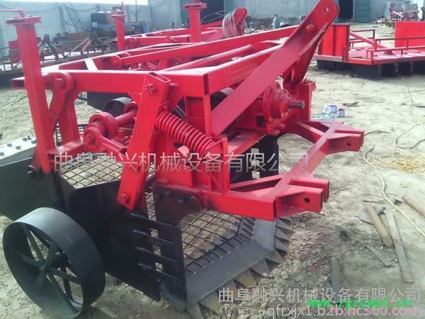 曲阜融兴药材收获机在于克服现有技术中的缺陷,提供一种结构简单、方便实用,省时省力和工作效率高的根茎类药材收获机,工作原理:经悬挂架将本机固定在大型**拖拉机后悬挂上,变速箱经动力输入轴与拖拉机上的输出轴相连接,开动机器,松土铲插入土壤中(如果深度不够,可以把拖拉机后边所带的上拉杆调短),将药材的根茎从土壤中铲出,根茎连同土块进入振动筛上,对包裹药材根茎的土块进行振动操作,振动掉一部分土块,振动后的土块和药材根茎进入前传输带上,再漏掉一部分土块,在前传输带运输的过程中,机子自带的碎土压辊可将大土块碾压成小土块,经过碾压处理后的土块和药材根茎进入后传输带上,压碎的土块经后传输带漏掉,后传输带将药材根茎送入回收箱内,完成药材的收割回收,网状式输送带可对药材根茎进行98%以上的回收,大大提高了工作效率。