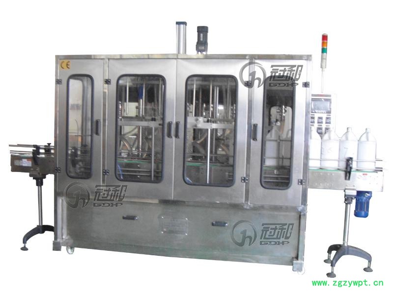 产品说明 概 述: 产品说明 概 述: GHALF型全自动柱塞式液体灌装机,是我公司适应市场需求,引进国外先进技术开发之新产品。该机采用316L不锈钢柱塞式计量泵执行灌装,根据使用厂家实际生产量,可选择不同灌装头数和泵体规格,并能方便地同理瓶机, 旋盖机联动生产,广泛应用于制药、农药、化工、食品、化妆品等行业的液体包装,完全 特 点: 1.采用柱塞式计量泵执行灌装,灌装精度高,泵的结构采用快接式拆卸机构,便于清洗、消毒。 2.适用低粘稠液体和水剂灌装,精度高. 3.柱塞式计量泵活塞环材质根据行业及液体成分的不同采用不同材质,特殊场合采用陶瓷材质。 4.进口PLC控制系统,变频调速,自动化程度高。 5.可一次调整全部计量泵的填充剂量,也可针对每个计量泵进行微幅调整;操作简便,调整快速。 6.灌装针头设计有防滴漏装置,无滴漏,潜入式灌装,防止起泡。 7.整机可适用不同规格的瓶子,调整简便,可在短时间内完成。 8.整机按GMP要求设计。 主要技术参数: 灌装范围:50-5000ml 灌装头数:4头、8头、12头 灌装精度:≤±1%标准装量 压缩空气压力:≤0.4-0.6Mpa 耗气量:15m3/h 电 源:220V 50Hz 用电功率:≤1.2Kw 单机噪音:≤50dB 净 重:≤1000Kg 生产能力: 四头:15瓶/分钟(以5000ml为例) 八头:30瓶/分钟 十二头:50瓶/分钟