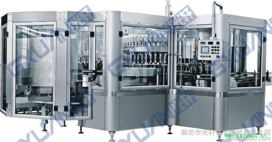 水、茶、果汁饮料灌装机设备集洗、灌、封为一体,适用于各种果汁饮料、茶饮料的热灌装生产,同时更换少量的零部件,便可用于纯净水,矿泉水的灌装。