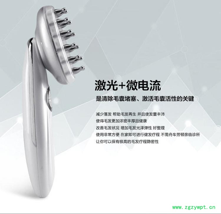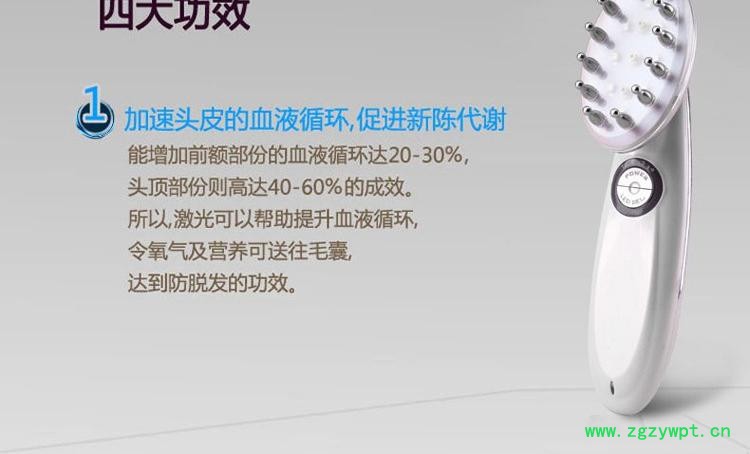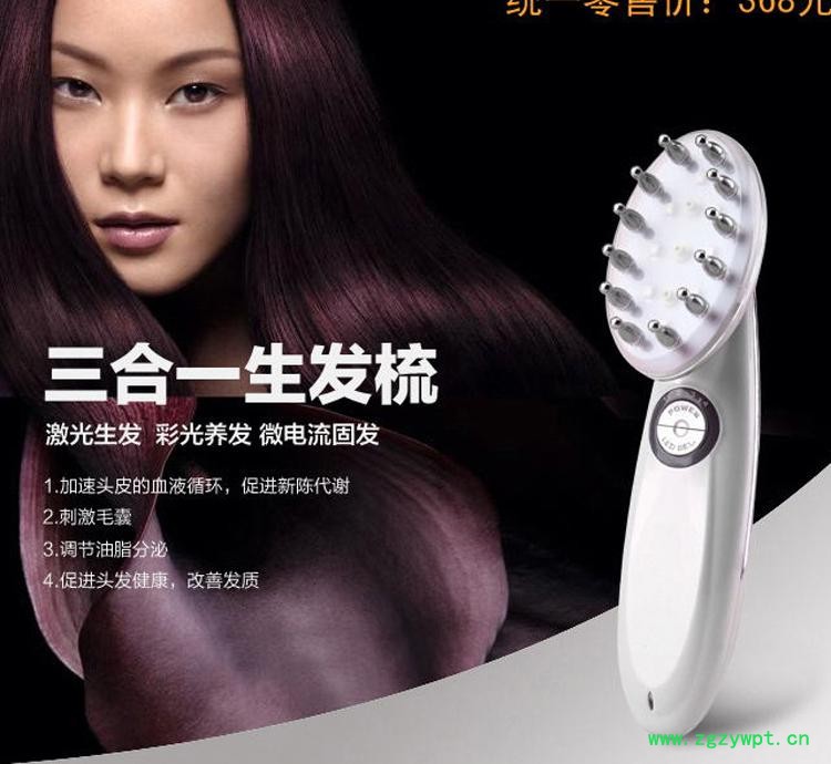 三合一生发梳 是一款护理头皮和头发的仪器。其波长为650nm激光能有效激活萎缩的头皮毛囊细胞,使其生物能量平衡,改善新陈代谢。在新陈代谢正常的情况下,头皮及毛囊组织将更充分的吸收营养,促进头发再生。与此同时,激光促进血液循环,加速营养到达毛囊组织,通过对加速毛发生长初期,中期和晚期的循环过程来促进毛发的生长。