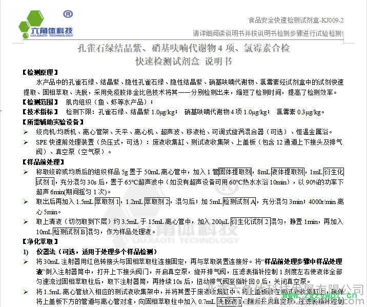 | 检测下限 | 孔雀石绿1.0μg/kg 硝代1.0μg/kg |
