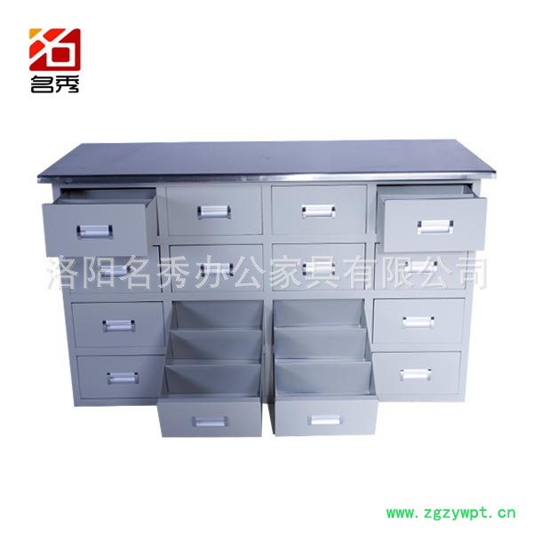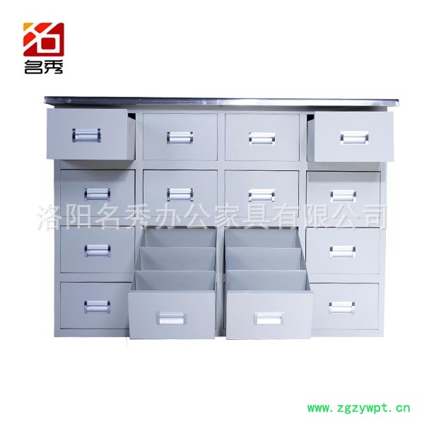 不锈钢、钢制中药柜柜体采用用**冷轧钢板精工制作,表面处理为聚能脂静电粉末喷涂(环保无毒害、无气味)。柜体可以颜色为经木红,浅灰色,每个小抽屉固定分成三格,可放一百多种中草药,有的下部抽屉可放较大药材,柜体内部全封闭,可防鼠、防潮、防串药,自制抽屉平导轨,推拉自如。以传统样式为基础,不断推出新的样式。在保存了传统风格的前提下,满足了现代多样性的需要,产品畅销全国各地区。洛阳名秀办公家具有限公司已拥有以不锈钢、钢板喷塑类为主的中药柜、中药台系列;西药柜、西药架系列;西药调剂台系列;护理病床系列;护理车系列;手术室系列;等二百多个品种,并可随时根据要求设计订做。