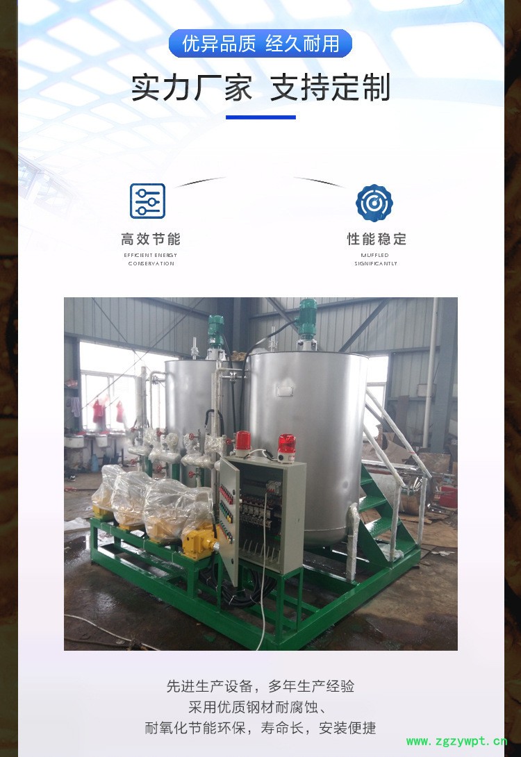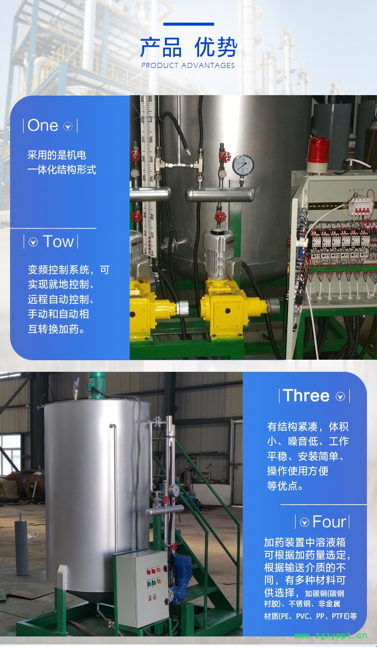 加药装置的单元组合形式主要视机组容量大小,锅炉配置的方式(二炉共用一套或单炉单套等),自动化水平的高低(自动或手动控制),加药泵种类的选用(交流或支流马达,进口或国产泵)灵活的组成各种不同形式单元,安装在一个底座上,这种工厂化的整套装置,大大减少了设计和现场安装的工作量,对整机的质量,安全和现场投运提供了可靠的保证.