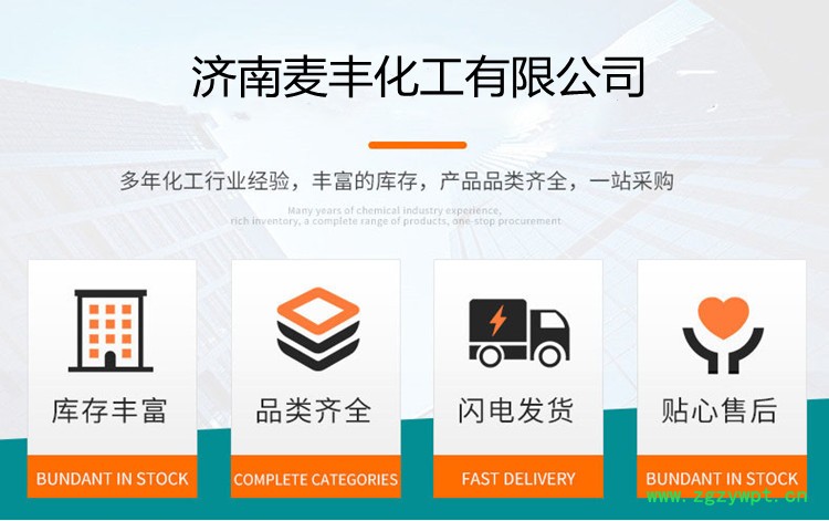 济南市较大的一家集科,工,贸于一体的民营化工企业。公司销售总部位于山东省会城市济南,地理位置优越,物流运输方便,能够快速的为用户提供各种质量优异,价格各理的化工产品。公司主要以精细化工产品的研发、生产、经营为主导方向,以自建生产基地,参股和控股的多种形式集合了众多有竞争力的化学品。产品涉及各类化工原料、医药中间体、颜料染料中间体、化学试剂、食品添加剂等众多领域。畅销全国30多个省市和地区。 公司始终坚持“,信誉至上”的服务宗旨,不断完善产品质量检测技术,建立了行业一级质量监督检验机构,配备有先进的质量检测仪器,产品品质稳步提升。同时公司积极对外合作,成为国内知名化工企业和国际跨国公司的代理商,为的生产商提供了的产品。稳定的产品质量,科学高效的管理和的服务,使赢得了国内外客户的信任和支持。目前已经发展成为生产,销售、仓储、运输、配送、服务为一体的现代化化工企业,与各行业领军企业保持着良好的业务往来关系。 公司以“质量是企业的生命,品牌是企业的形象,诚信是企业的声誉”为企业使命,秉承“开拓创新,科学管理,产品,顾客满意”的质量方针,奉行“科技,创造和谐环境”的价值观,倡导“服务,诚信待人,为顾客创造价值”的理念,不断提升企业核心竞争力,强化企业文化的建设;我们愿与各界朋友在相互了解,相互信任的基础上,与广大新老客户双赢合作,共同发展,共创辉煌!并热诚欢迎新老客户光临我公司考察访问、指导、洽谈,我们将诚心诚意为您提供的服务,随时愿意聆听您的需求和建议,我们期待您的声音!