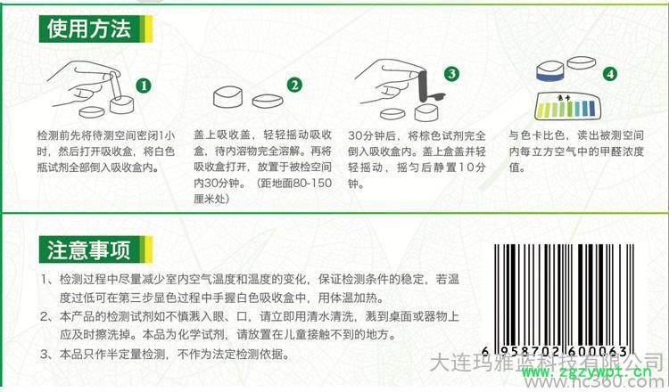 本产品采用改进的化学吸附模式,无需任何仪器设备,快速方便地检测空气中的甲醛含量。苯、甲苯、二甲苯、氨、一氧化氮、等其它常见室内空气污染物质对本测定方法无干扰。