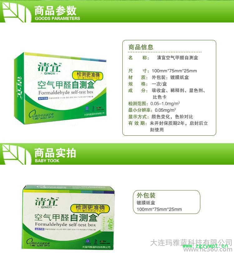 本产品主要用于对房间内、汽车内或家具中可能存在的甲醛污染进行一次性现场快速检测,亦可用于甲醛清除剂清除效果的对比检测。每盒检测一次一次性包装; 检测范围0.05~1.0mg/m3; 检测下限0.05 mg/m3