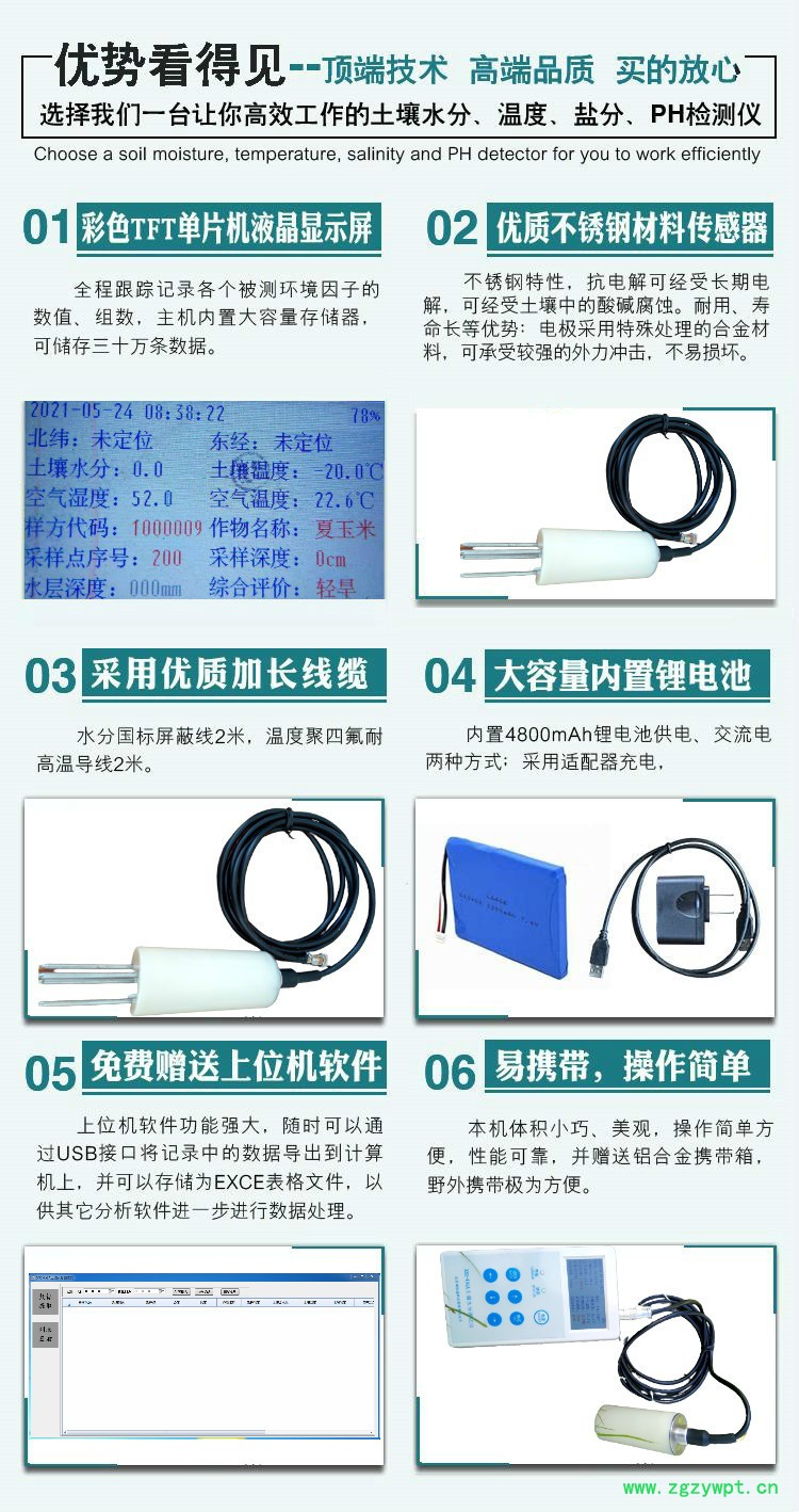 土壤温度测量范围:-20~80℃,精度:±0.5℃
