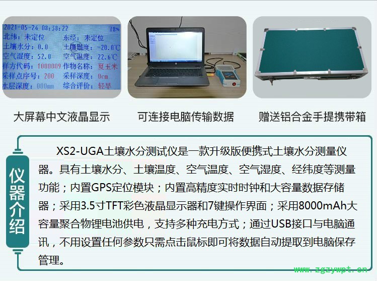 XS2-UGA土壤水分测试仪是北京墒信通科技有限责任公司基于物联网思维设计的便携式土壤水分测量仪表。XS2-UGA具有土壤水分、土壤温度、空气温度、空气湿度等测量功能;内置GPS实时定位模块;内置高精度实时时钟和大容量数据存储器;采用3.5寸TFT彩色液晶显示器和7键操作界面;采用8000mAh大容量聚合物锂电池供电,支持多种充电方式;通过USB接口与电脑通讯,无需任何操作即可自动提取数据。
