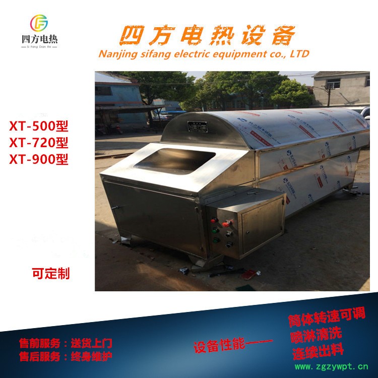 该机采用筒式旋转式,不锈钢制成,配有高压水泵喷淋,水源选用自来水源和直接水源两用,能够反复倒顺清洗,进