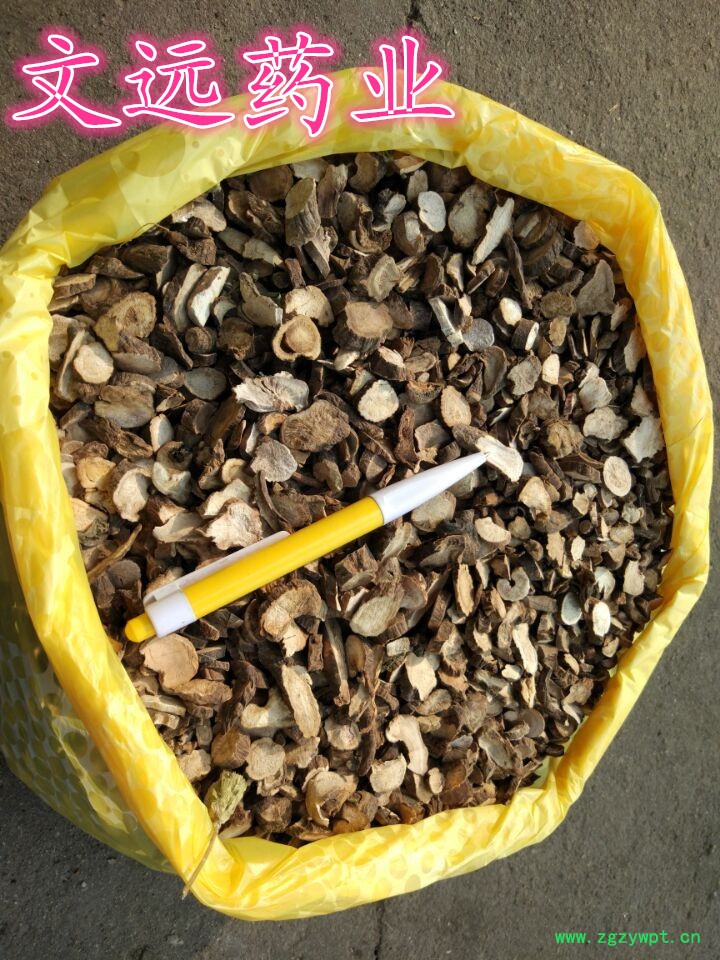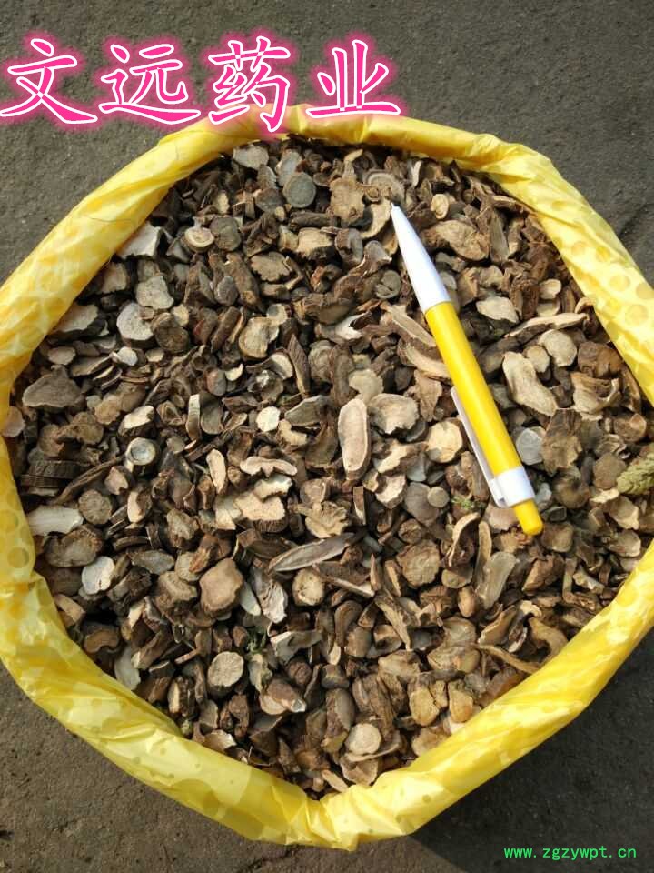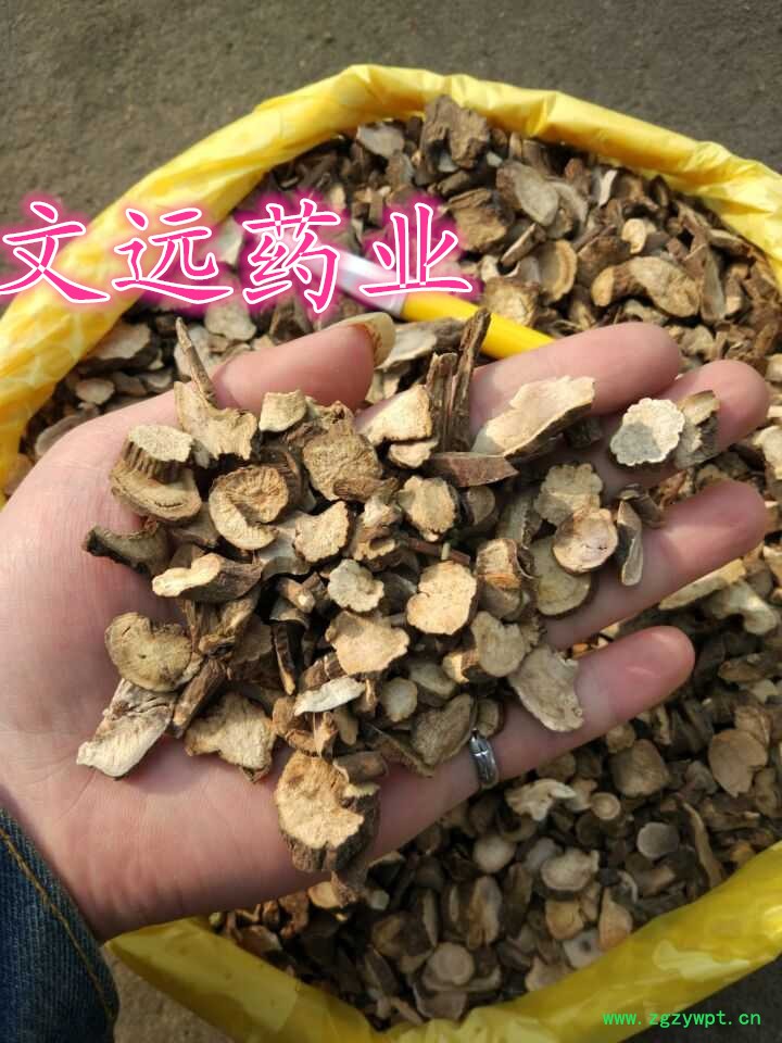 [性 状]:该药材干燥根呈圆柱形,粗细均匀而平直,长10~20厘米,直径1~1.8厘米。表面淡红棕色或粉白色,平坦,或有明显的纵皱及须根痕,栓皮未除尽处有棕褐色斑痕,偶见横向皮孔。质坚实而重,不易折断。断面灰白色或微带棕色,木部放射线呈菊花心状。气无,味微苦而酸。以根粗长、匀直、质坚实、粉性足、表面洁净者为佳。。