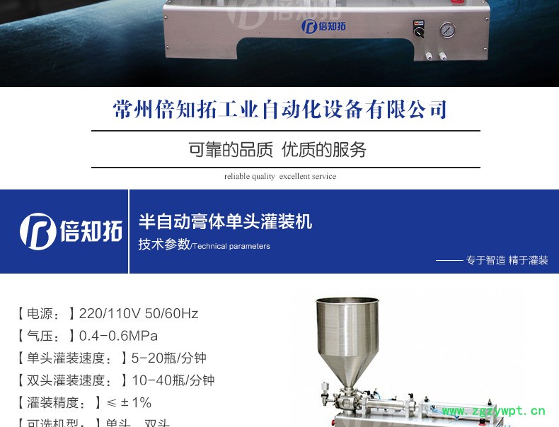 常州倍知拓工业自动化有限公司专注于灌装机的研发、生产、销售和维护,主要应用于调味品、食品、日用品等行业,特别是含有颗粒的酱类产品和高粘度产品的灌装。倍知拓在国内市场属于一颗冉冉升起的新星,本着开拓创新,提供**的产品和服务的原则,努力提高客户对我们的满意和信任。我们愿怀抱一颗赤子之心,坚持创新,完善服务,与客户携手创造高能生产力。