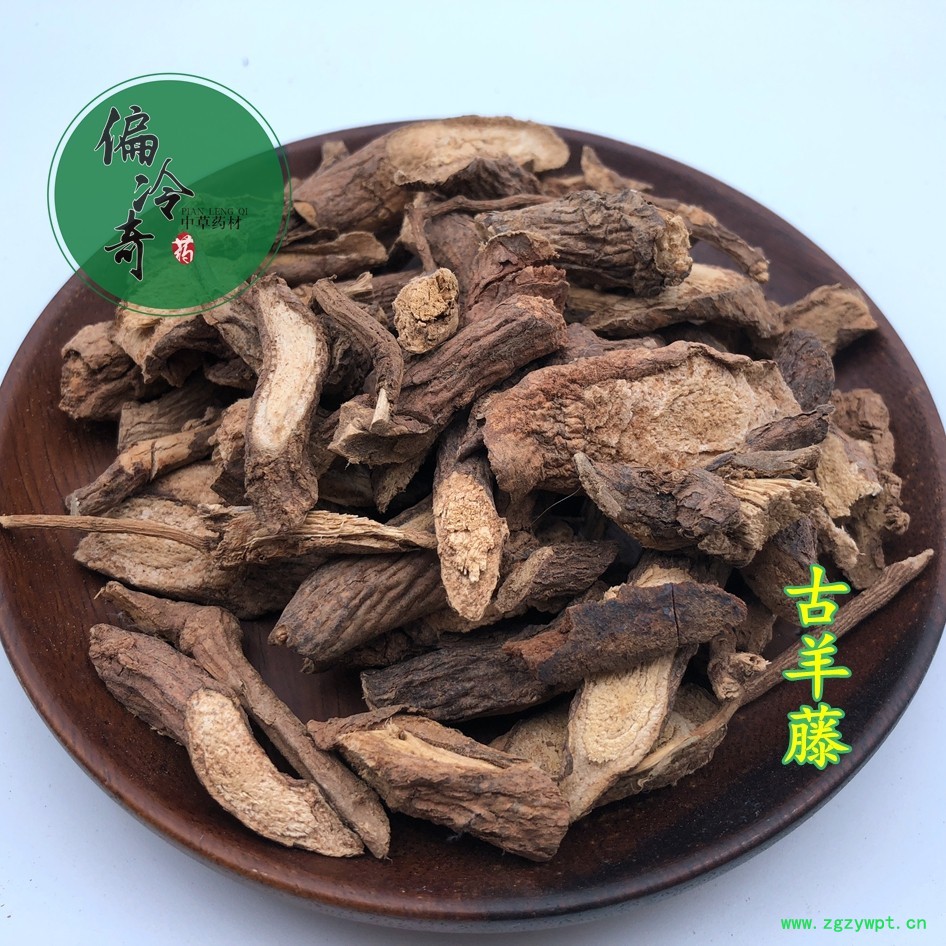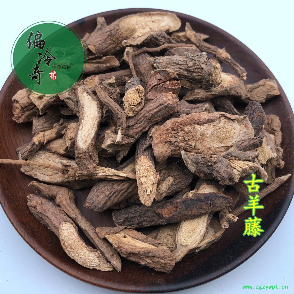 根呈圆柱形,弯曲,表面暗棕色,有小瘤状突起和不规则的纵皱纹。质硬,断面不平,横切面皮部棕色,木部淡黄色,射线纤细,导管显著,呈小孔状。