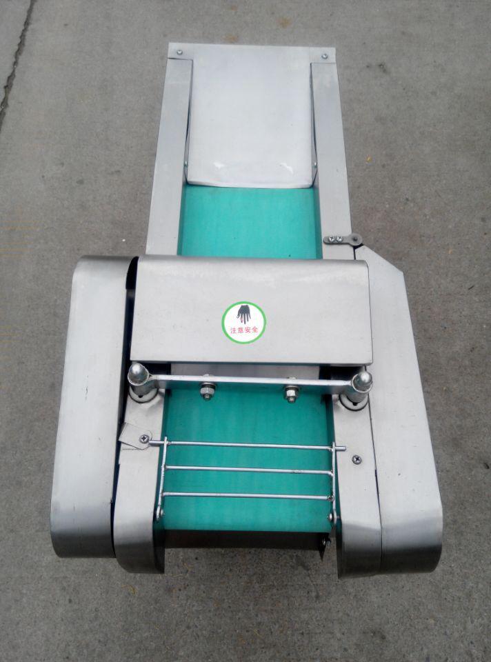 先转动可调偏心轮,使刀架行至下死点后,再使刀架向上抬起1/2毫米,使竖刀与输送带接触后,紧固螺母把竖刀紧固在刀架上。说明:刀架抬起高度可根据所切蔬菜自行掌握。如果高架抬起高度小,蔬菜有可能连刀,如果高架抬起高度过大,有可能切坏输送带。