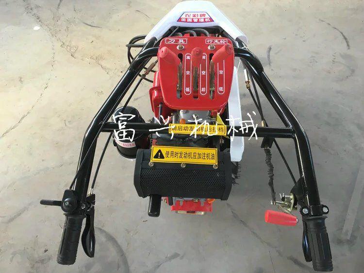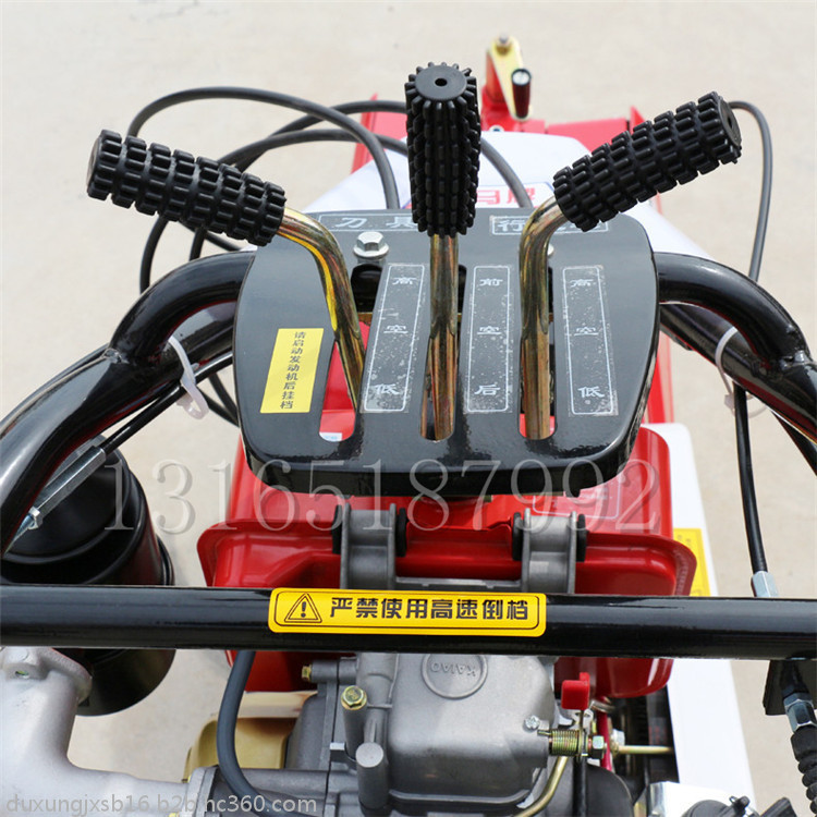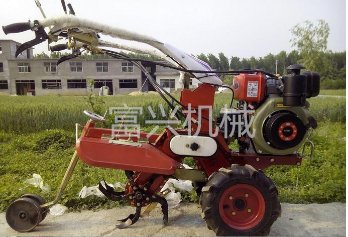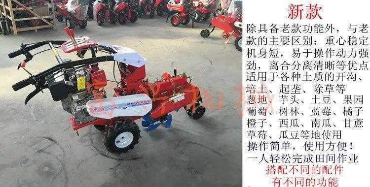 本机器包括机架、可调高低扶手,机架上设有(风冷或水冷)柴油机或汽油机、机架和扶手上设置有变速箱,变速箱的输出轴上设置有能够沿轴移动的驱动轮或链轨.传动方式主要有:全齿轮传动、皮带传动、链条传动三种传动方式.该机具有重量轻,油耗低、相对功率大,结构紧凑、机动性强、操纵轻便灵活的特点。可爬坡、越埂、阶梯性强。广泛适用于平原、山区、丘陵的旱地、水田、果园、菜地、烟地的深旋耕、浅旋耕、犁耕。配上相应机具可进行旱地旋耕、水田旋耕、抽水、开沟、喷淋、喷药除草碎土等作业,还可牵引拖车进行短途运输,是大中型农机无法媲美的多功能田园管理机,工作稳定可靠、使用寿命长、维修方便等特点。是进入农民家庭田园管理机 自动差速器的田园管理机,可以360度自由转弯,在田间可随意控制方向,极大的方便操作,此外该机采用整体铸造变速箱体,结实耐用,采用干式摩擦离合器,安全可靠。是农民朋友的好帮手