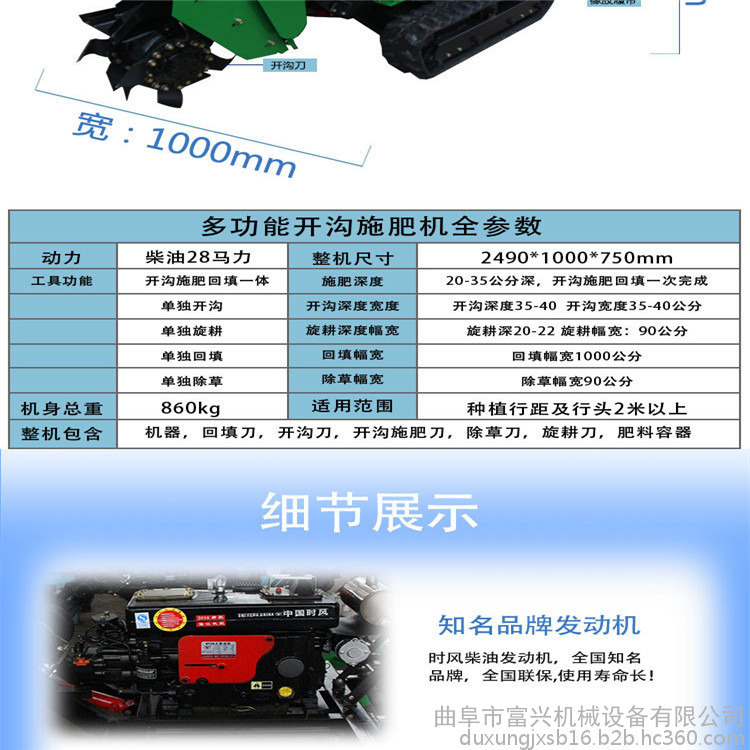 该产品主要有五大功能:开沟施肥自动回填完成(化肥+有机肥)、单独开沟施土杂肥、更换回填、旋耕、除草装置后可进行回填、旋耕和除草作业;该机体积小,重心低,操作灵便,可原地转向,适用于葡萄、果树、核桃、枸杞、蓝莓等经济作物的开沟施肥作业。