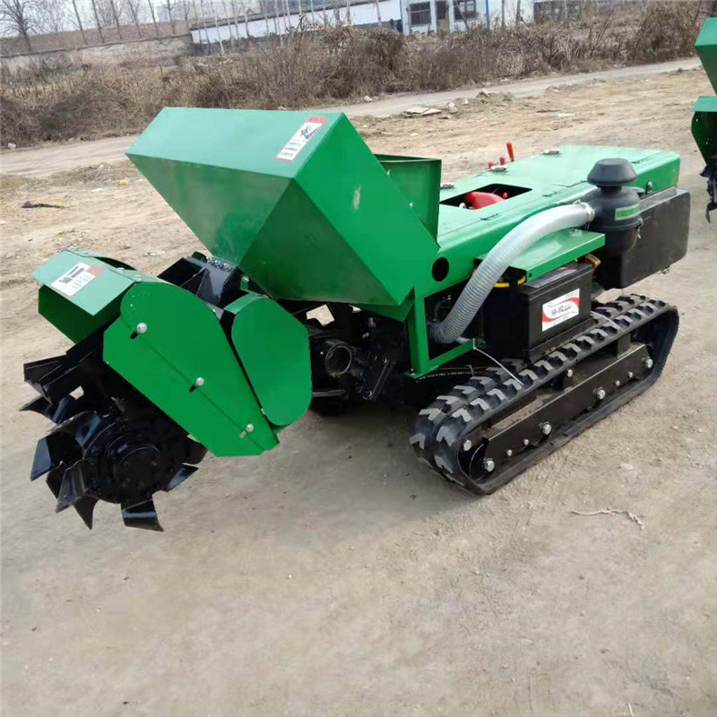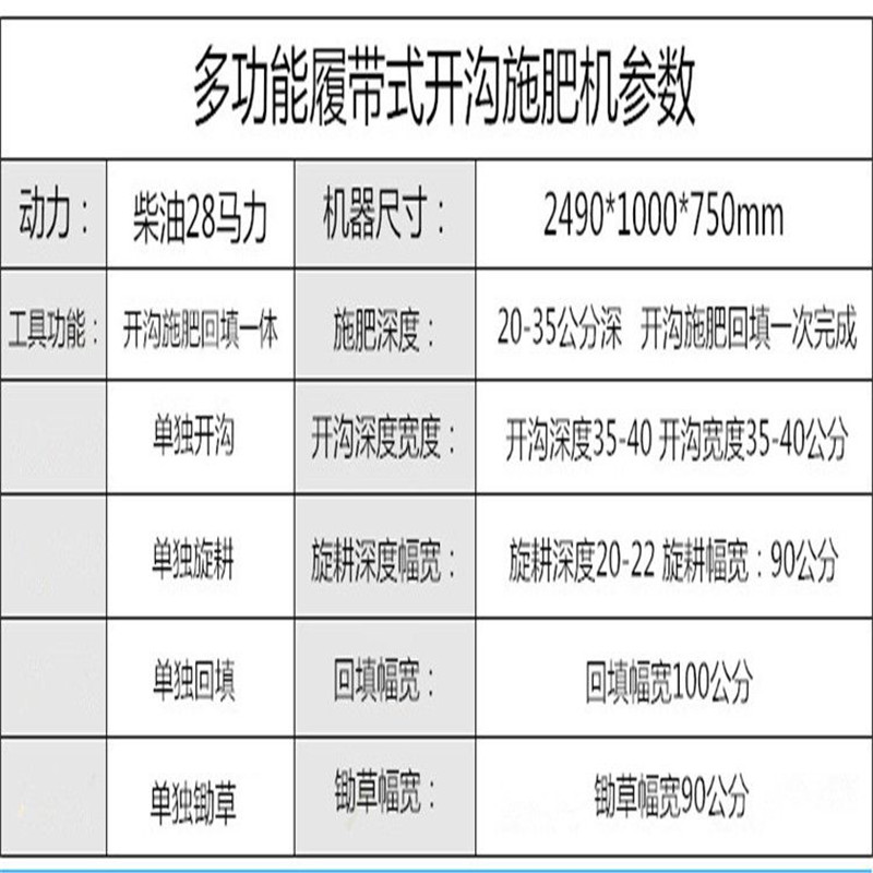 多功能 履带式开沟施肥机安装上不同的配件可以进行单独旋耕、回填、单独开沟、施肥、也可混合搭配使用。产品结实耐用,性能优越,操作方便.耐用:机身加厚,密,履带式行走,可进行原地转向。刀具都是加厚75号猛钢锻造,非常耐磨耐用,工作效率高.(1)精施肥,有机肥粉状肥可以调整到每米低半斤的施肥量