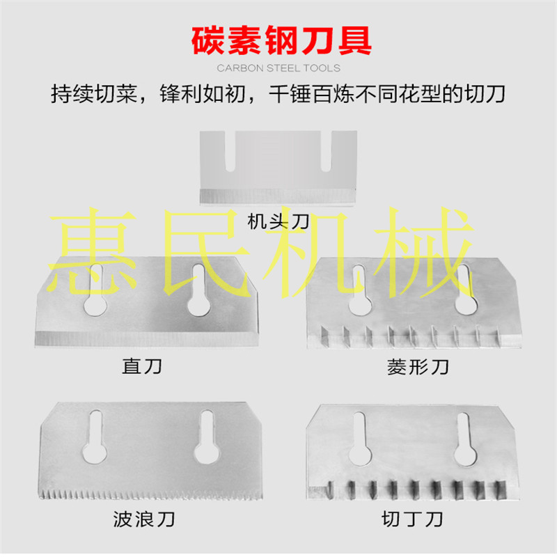 2、本机适用于硬、软各种根、茎、叶类蔬菜和海带的加工,可切制成片、块、丝、丁、菱形、曲线形多种花样。