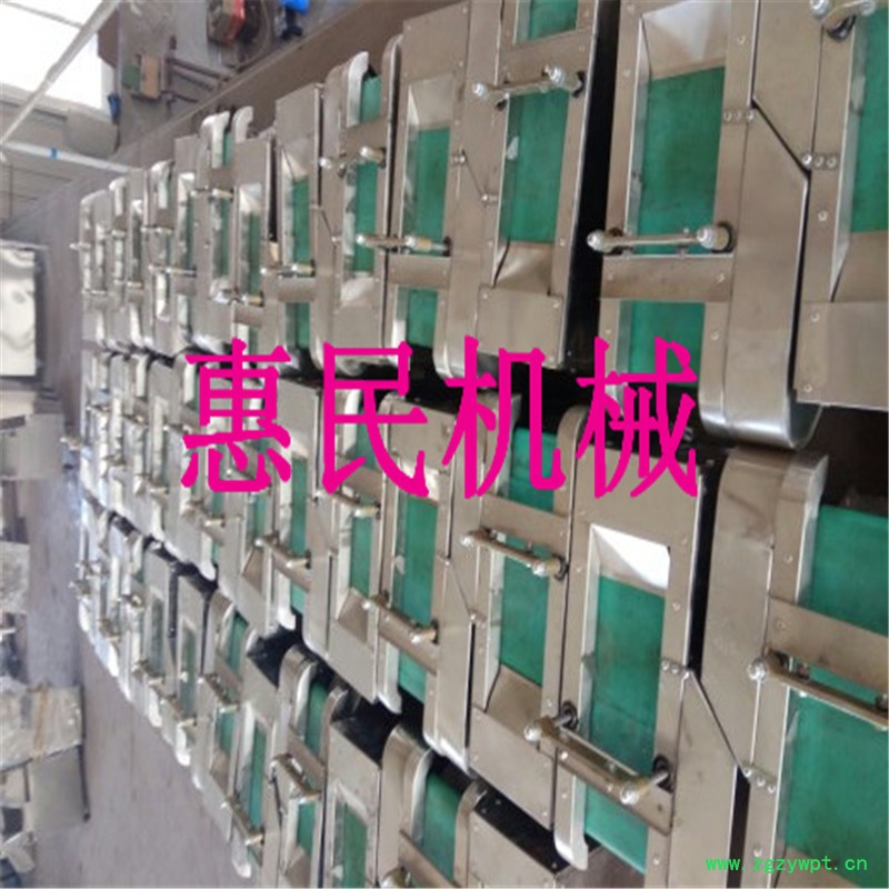 先转动可调偏心轮,使刀架行至下死点后,再使刀架向上抬起1/2毫米,使竖刀与输送带接触后,紧固螺母把竖刀紧固在刀架上。说明:刀架抬起高度可根据所切蔬菜自行掌握。如果高架抬起高度小,蔬菜有可能连刀,如果高架抬起高度过大,有可能切坏输送带。