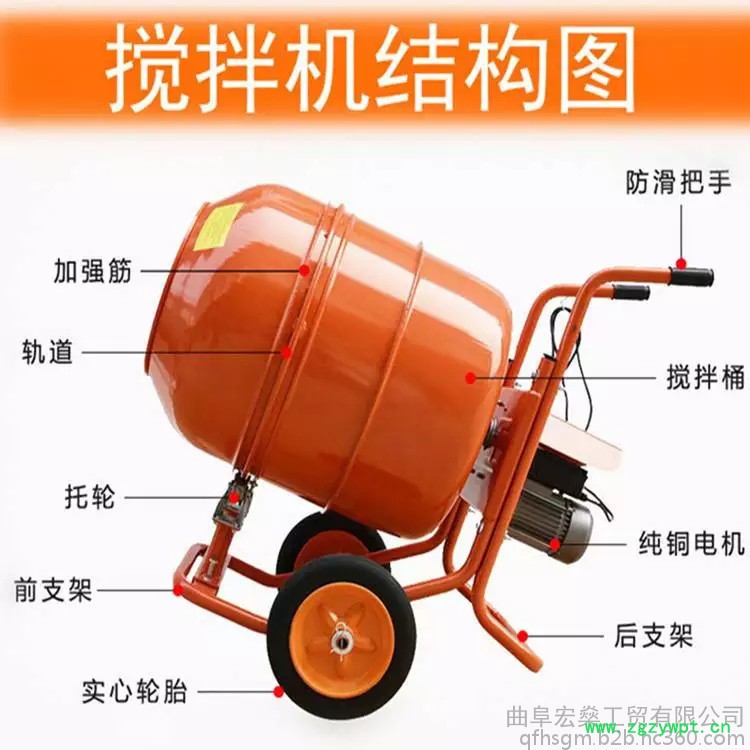 手推式滚筒搅拌机由万向节、扶手、电机、后支架、轨道、搅拌桶、轨道论、行走轮组成。经典设计,多功能使用,有了它事半功倍。