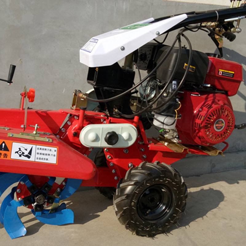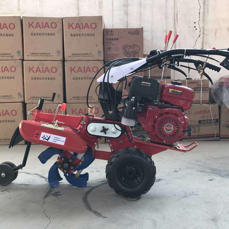 本机器包括机架、可调高低扶手,机架上设有(风冷或水冷)柴油机或汽油机、机架和扶手上设置有变速箱,变速箱的输出轴上设置有能够沿轴移动的驱动轮或链轨.传动方式主要有:全齿轮传动、皮带传动、链条传动三种传动方式.该机具有重量轻,油耗低、相对功率大,结构紧凑、机动性强、操纵轻便灵活的特点。可爬坡、越埂、阶梯性强。广泛适用于平原、山区、丘陵的旱地、水田、果园、菜地、烟地的深旋耕、浅旋耕、犁耕。配上相应机具可进行旱地旋耕、水田旋耕、抽水、开沟、喷淋、喷药除草碎土等作业,还可牵引拖车进行短途运输,是大中型农机无法**的多功能田园管理机,工作稳定可靠、使用寿命长、维修方便等特点。是进入农民家庭**的田园管理机。