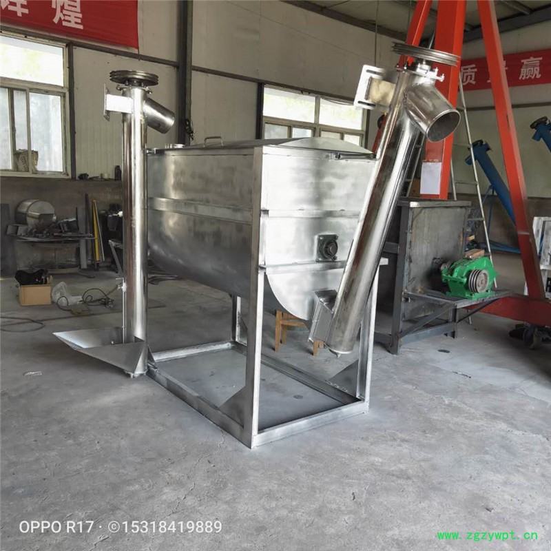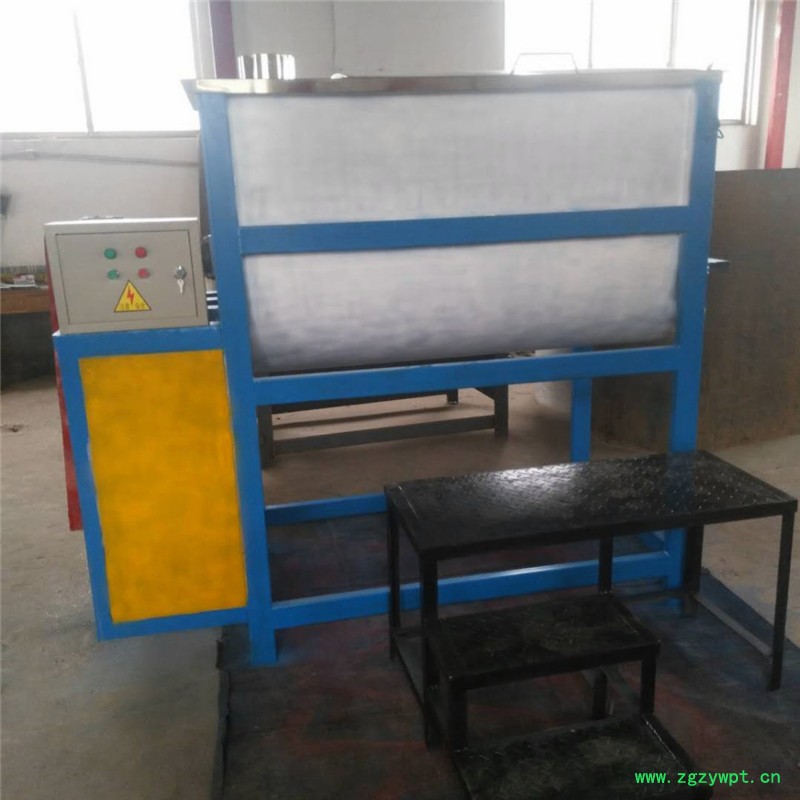卧式 搅拌机的工作原理:卧式筒体内装有双轴旋转反向的浆叶,浆叶成一定角度将物料沿轴向、径向循环翻搅,使物料迅速混合均匀卧式混合机性能特点减速机带动轴的旋转速度与桨叶的结构会使物料重力减弱,随着重力的缺乏,各物料存在颗粒大小、比重悬殊的差异在混合过程中被忽略。激烈的搅拌运动缩短了一次混合的时间,更快速、更高效。 即使物料有比重、粒径的差异,在交错布置的搅拌叶片快速剧烈的翻腾抛洒下,也能达到很好的混合效果。混合均匀度高,残留量少。