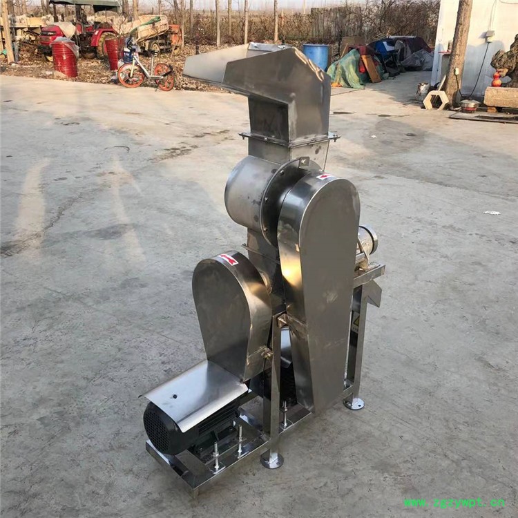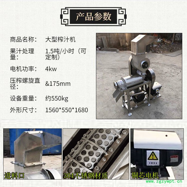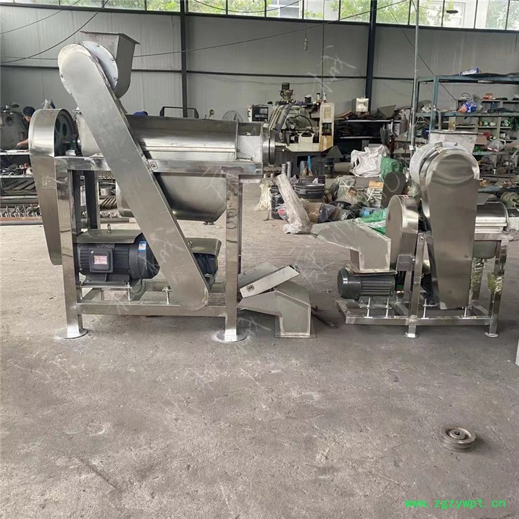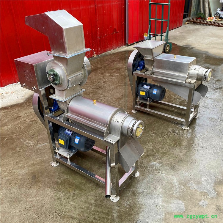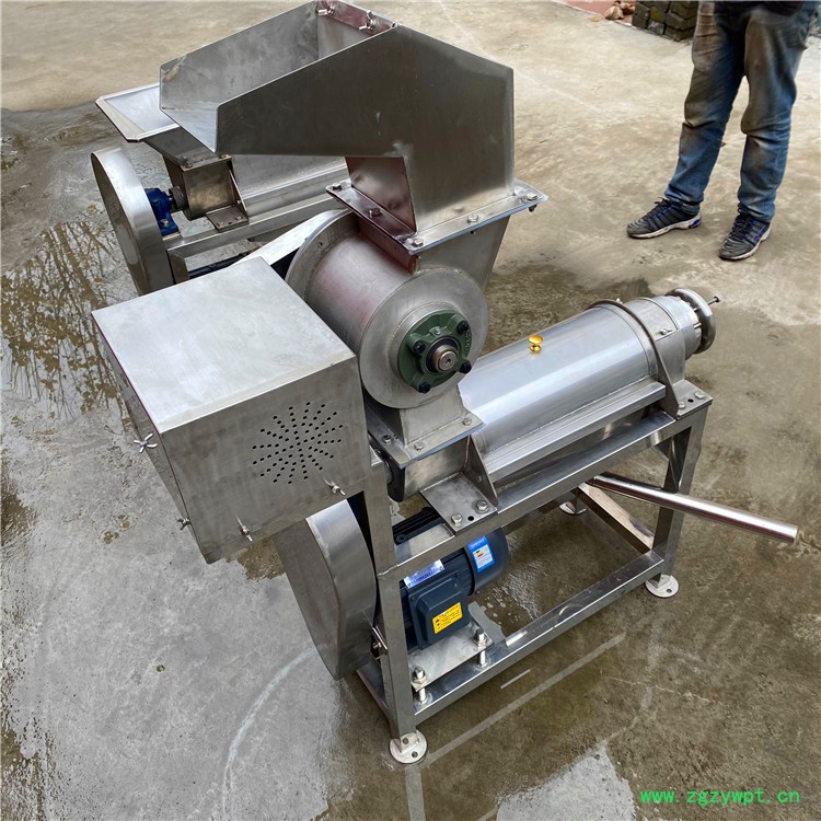 螺旋主轴的旋转方向从进料斗向渣槽方向看去,为顺时针方向。原料加入进料斗中,在螺旋的推进下受压,其压榨的汁液通过过滤网流入底部的盛汁器,而废料则通过螺旋及调压的锥形部分之间形成的环状空隙排出,调压头沿轴向的移动可调整空隙的大小。用于顺时针(从设备的出渣槽向进料斗端看转动手轮轴时承座时,调压头向左,空隙即缩小、反之则空隙变大。)改变空隙的大小,即调整排渣的阻力。即可改变出渣率,但如果空隙过小,在强力挤压下,部分渣的颗粒会和汁一起通过过滤网被挤出,尽管出汁增加,但汁的质量相对下降,空隙的大小应视用户具体工艺要求而定。