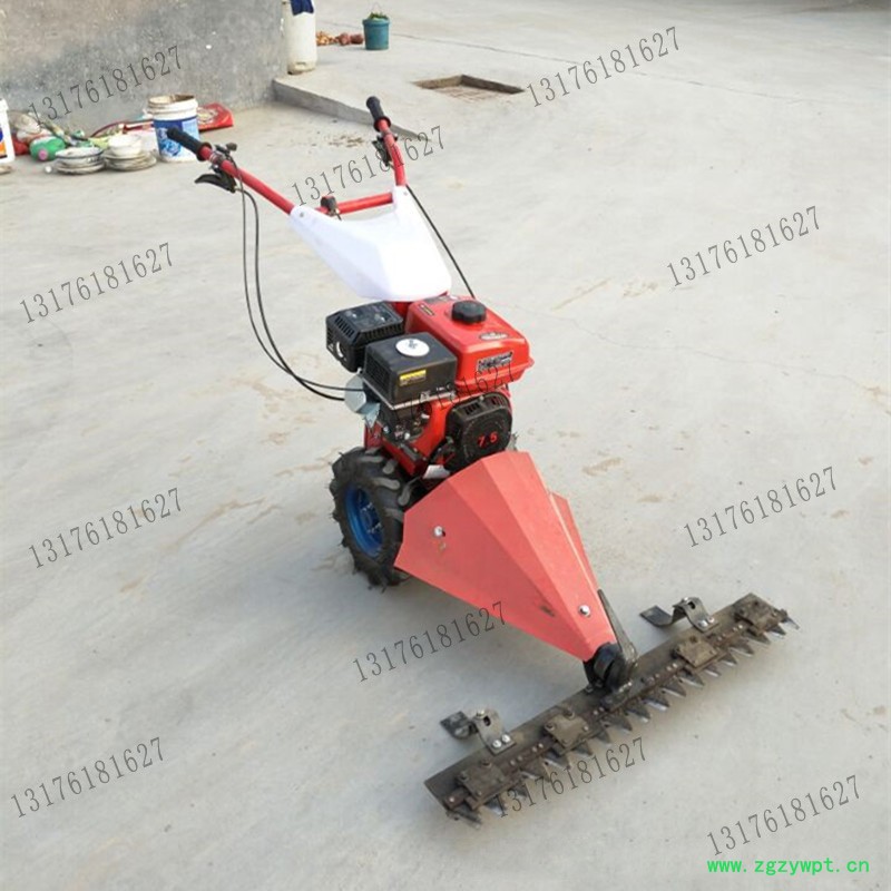 往复式手扶动力中央传动T型双驱动轮割草机,该机适用于农/牧区平坦草场和山地、丘陵地带草场,主要用于草坪修整、牧草收割、田园管理、灌木修整等。发动机为四冲程空冷汽油机,靠反弹式起动器启动。传动平稳,无能量损失。环保设计,符合欧Ⅱ排放标准。变速箱输出采用专用离合器实现行走无级变速。割刀由装在偏心轮曲柄上的滚轮直接驱动刀条上的滑槽来运动,偏心轮机构通过一级皮带传动与底盘传动箱前端的动力输出皮带相连,离合器采用结合子式齿型离合器。往复式割刀离合控制、油门开关控制、紧急熄火开关控制均设在操作扶手上,手把在垂直方向上下可调整,切割刀片由特种铬钢精制而成,耐磨性能好,刀片间隙可通过压刃器垫片调整。割刀导向准确平稳,为了整加行进附着力,轮胎采用人字型胶轮。传动机构加装防护罩,使用安全。该机具有用途广泛、运转平稳、功率消耗低,切割质量好,不堵刀等优点。