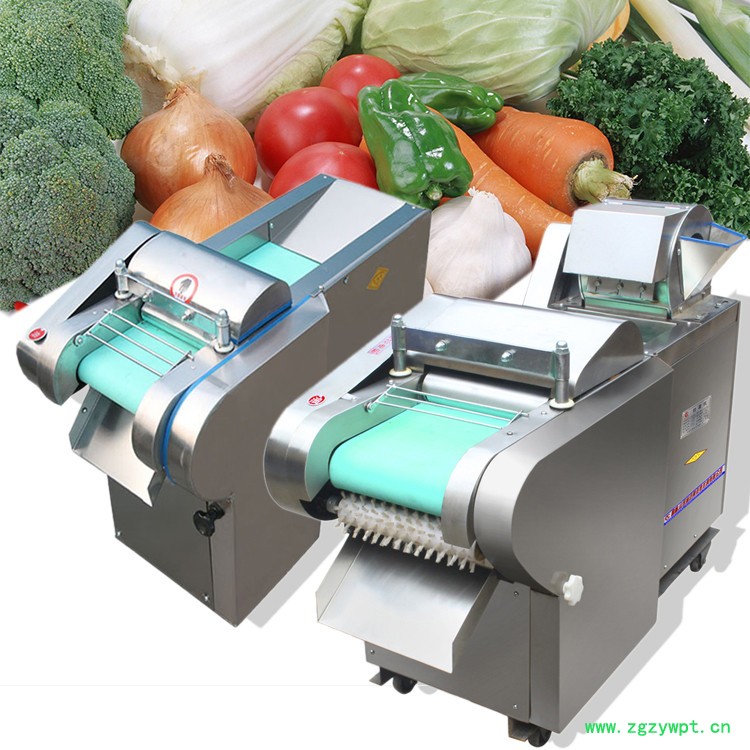 多功能型切菜机包含单切机的所有功能的同时,也可切圆形如土豆、萝卜等。 可将根、茎、叶等蔬菜加工成片、丝、丁、菱、曲线、花丁、花片等。切片装置用于硬菜(萝卜、土豆、水果、薯类)的切片,厚度在1-10毫米内自由调整;往复竖刀将刀成的菜片或软菜(韭菜、芹菜)切成直丝或段、曲线丝、方丁(或形刀)输送带每次移动距离1-20毫米自由调整。所调整量即为丝段的宽度;应注意被切菜直径较粗时(大于30毫米)出片效果才好,便于切丁,直径小时制的片或丁将会杂乱。被切菜加工面平整光滑、规则,组织完好,保持手工切制的效果。