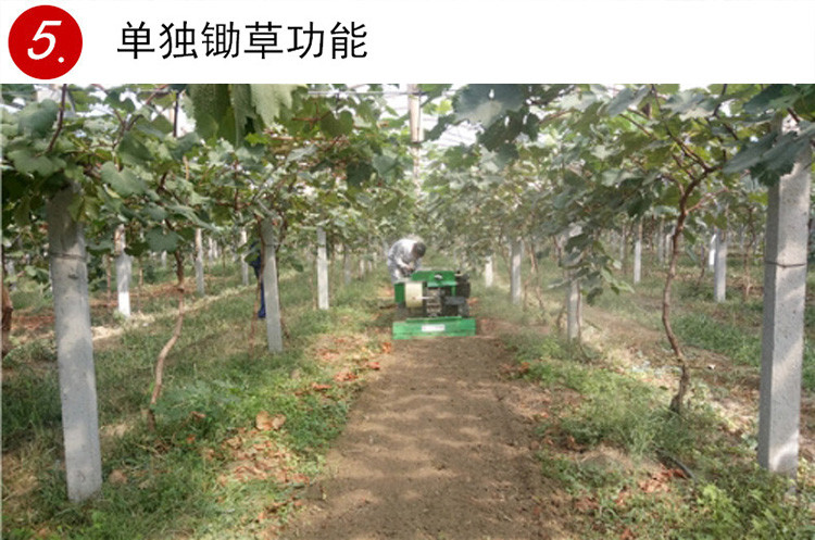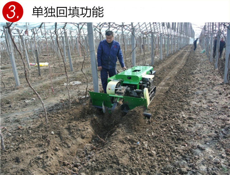 该产品主要有五大功能:开沟施肥自动回填一次性完成(化肥+有机肥)、单独开沟填土施肥、更换回填、旋耕、除草装置后可进行回填、旋耕和除草作业;该机体积小,重心低,操作灵便,可原地转向,适用于葡萄、果树、核桃、枸杞、蓝莓等经济作物的开沟施肥作业。
