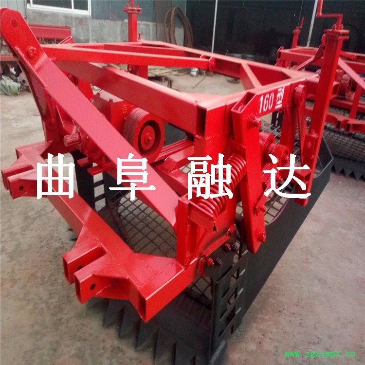 曲阜融达药材收获机在于克服现有技术中的缺陷,提供一种结构简单、方便实用,省时省力和工作效率高的根茎类药材收获机,工作原理:经悬挂架将本机固定在大型**拖拉机后悬挂上,变速箱经动力输入轴与拖拉机上的输出轴相连接,开动机器,松土铲插入土壤中(如果深度不够,可以把拖拉机后边所带的上拉杆调短),将药材的根茎从土壤中铲出,根茎连同土块进入振动筛上,对包裹药材根茎的土块进行振动操作,振动掉一部分土块,振动后的土块和药材根茎进入前传输带上,再漏掉一部分土块,在前传输带运输的过程中,机子自带的碎土压辊可将大土块碾压成小土块,经过碾压处理后的土块和药材根茎进入后传输带上,压碎的土块经后传输带漏掉,后传输带将药材根茎送入回收箱内,完成药材的收割回收,网状式输送带可对药材根茎进行98%以上的回收,大大提高了工作效率。