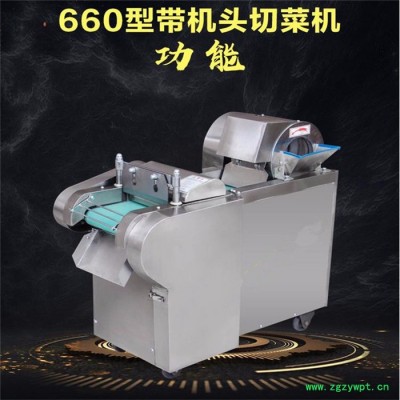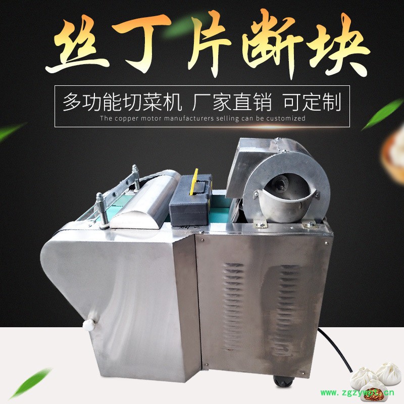 包含单切机的所以功能的同时,也可切圆形如土豆、萝卜等。可将根、茎、叶等蔬菜加工成片、丝、丁、菱、曲线、花丁、花片等。切片装置用于硬菜(萝卜、土豆、水果、薯类)的切片,厚度在1-10毫米内自由调整;往复竖刀将刀成的菜片或软菜(韭菜、芹菜)切成直丝或段、曲线丝、方丁(或形刀)输送带每次移动距离1-20毫米自由调整。所调整量即为丝段的宽度;应注意被切菜直径较粗时(大于30毫米)出片效果才好,便于切丁,直径小时制的片或丁将会杂乱。被切菜加工面平整光滑、规则,组织完好,保持手工切制的效果。